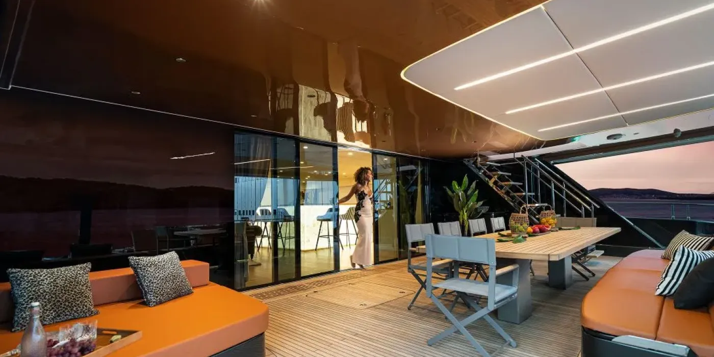 • Zonas exteriores: flybridge amplio con bar, soláriums, jacuzzi en algunos casos, cockpit de popa generoso, plataforma hidráulica trasera, garaje para tenders o “toys” náuticos.