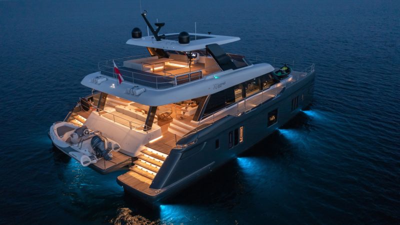 El 70 Sunreef Power Eco continúa el legado de los catamaranes eléctricos personalizables y aptos para navegar de Sunreef Yachts. De hecho, es una embarcación de lujo dinámica y elegante, que pertenece a la nueva gama de catamaranes a motor del astillero, que incluye el 60 Sunreef Power Eco, 70 Sunreef Power Eco, 80 Sunreef Power Eco y 100 Sunreef Power Eco. El amplio salón de la cubierta principal del 70 Sunreef Power Eco se integra perfectamente con la cabina de popa, creando una gran zona de comedor y solárium semiabierta. El tragaluz, los ventanales panorámicos y la amplia puerta corredera permiten que entre mucha luz solar en los interiores completamente personalizables. Los generosos volúmenes dentro de los cascos del yate eléctrico ofrecen infinitas opciones para un diseño a medida. Los camarotes de la tripulación y la cocina pueden ubicarse en la popa y accederse exclusivamente desde la bañera para mayor privacidad a bordo. La bañera de popa ofrece un espacio para cenar al aire libre cerca del agua, así como un excelente lugar para disfrutar de deportes acuáticos con fácil acceso a juguetes y motos de agua personales. Gracias a su innovador garaje en popa y plataforma hidráulica, el 70 Sunreef Power Eco puede lanzar el tender y la moto de agua en cualquier momento. El 70 Sunreef Power cuenta con una gran terraza en la proa con muebles independientes y un salón protegido del sol y el viento. El flybridge del lujoso catamarán ofrece un nivel de comodidad inigualable con más que suficiente espacio para una piscina spa, un bar, un comedor y grandes colchonetas para tomar el sol. El 70 Sunreef Power Eco también está disponible en la versión clásica.